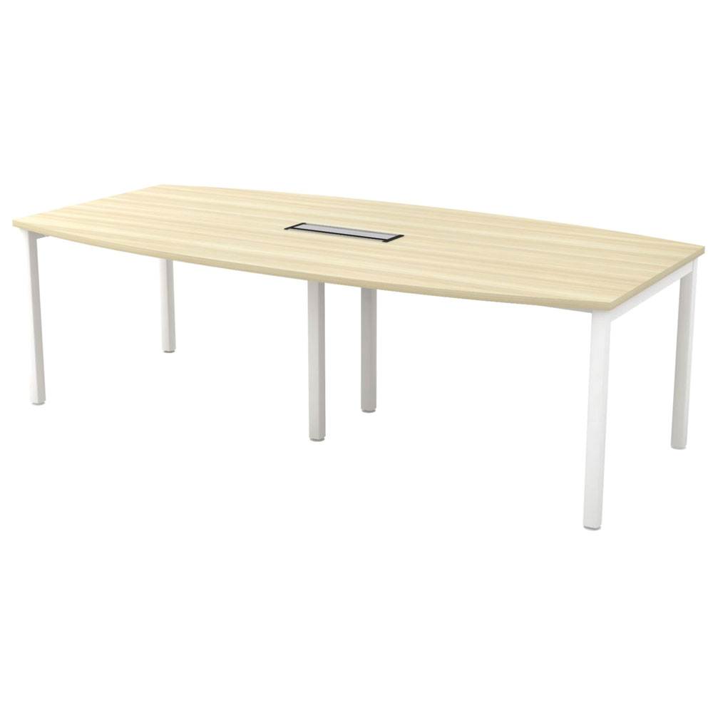 boat-shape conference table (2400W x 1200/900D x 750H) featuring a light wood finish, a central wire box, and sturdy white metal legs, designed to accommodate a larger group for meetings and discussions.