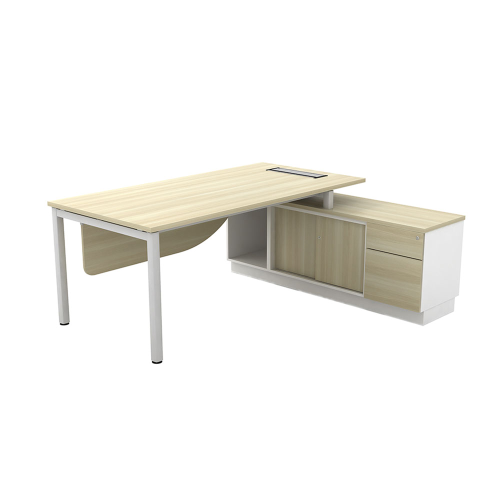 A spacious and modern director table set (2160W x 900D x 750H) featuring a main desk, a side table, a built-in fixed pedestal (1D1F), and sleek white metal legs, offering a complete and organized workspace.